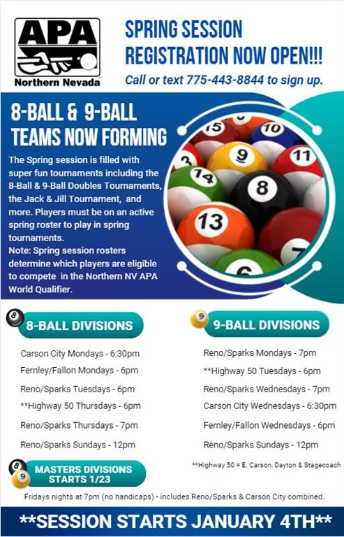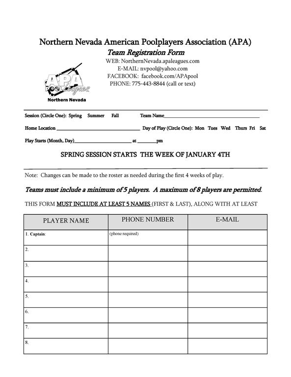 Simply fill it out, take a cell phone picture of it & text/email it to us at nvpool@yahoo.com. If your team is continuing from last session, a simple text message to 775-443-8844 - letting us know your team is returning - is all we need.
