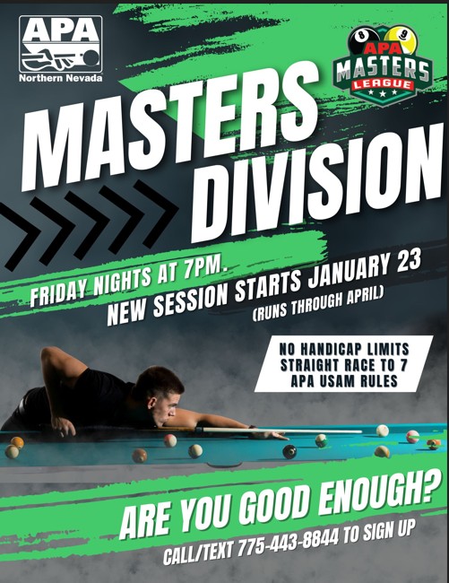 The Northern Nevada APA Masters Division starts on Friday, January 23rd and runs through the end of April. Registration open now. This is a great format for higher-skilled players (or anyone who wants to improve their game by playing with the best!). NO HANDICAPS.